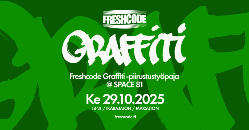 FRESHCODE GRAFFITI -piirustustyöpaja @ Space 81, Ke 29.10. 22.10.2025 Tervetuloa mukaan vapaamuotoiseen FRESHCODE GRAFFITI -piirustustyöpajaan Ke 29.10. klo 18-21.... Lue lisää »