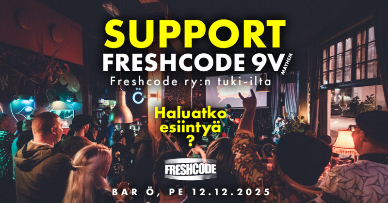 SUPPORT FRESHCODE 9v MAYHEM – Freshcode ry:n tuki-ilta: TBA @ Bar Ö, Pe 12.12.2025 – ESIINTYJÄHAKU! 14.11.2025 Kokoonnumme joulukuussa juhlistamaan Freshcode ry:n 9-vuotista matkaa, viettämään yhteisöllistä iltaa... Lue lisää »